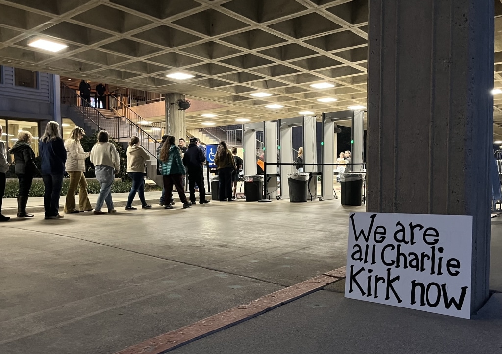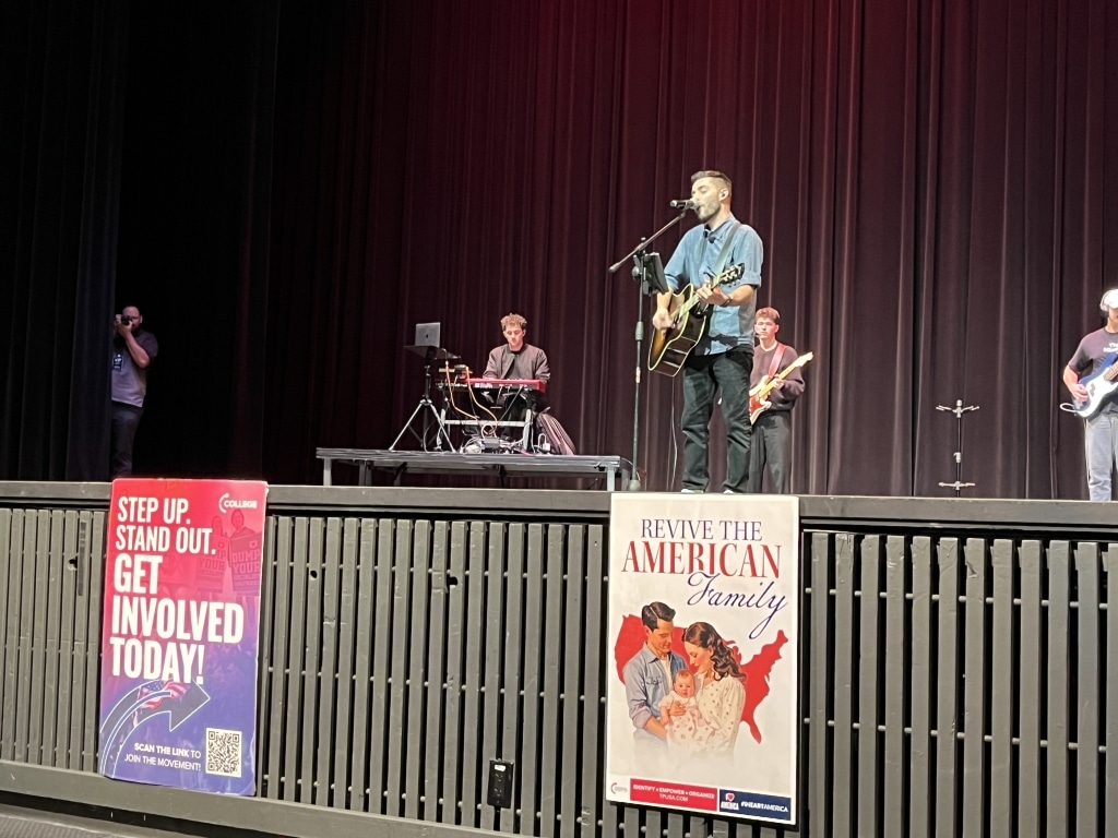 As cars rolled into the auditorium parking lot, attendees walked through metal detectors to check in at the entrance. The event began with an introductory worship session before the most politically charged portion of the event began — a 7-minute video introduction produced by TPUSA.