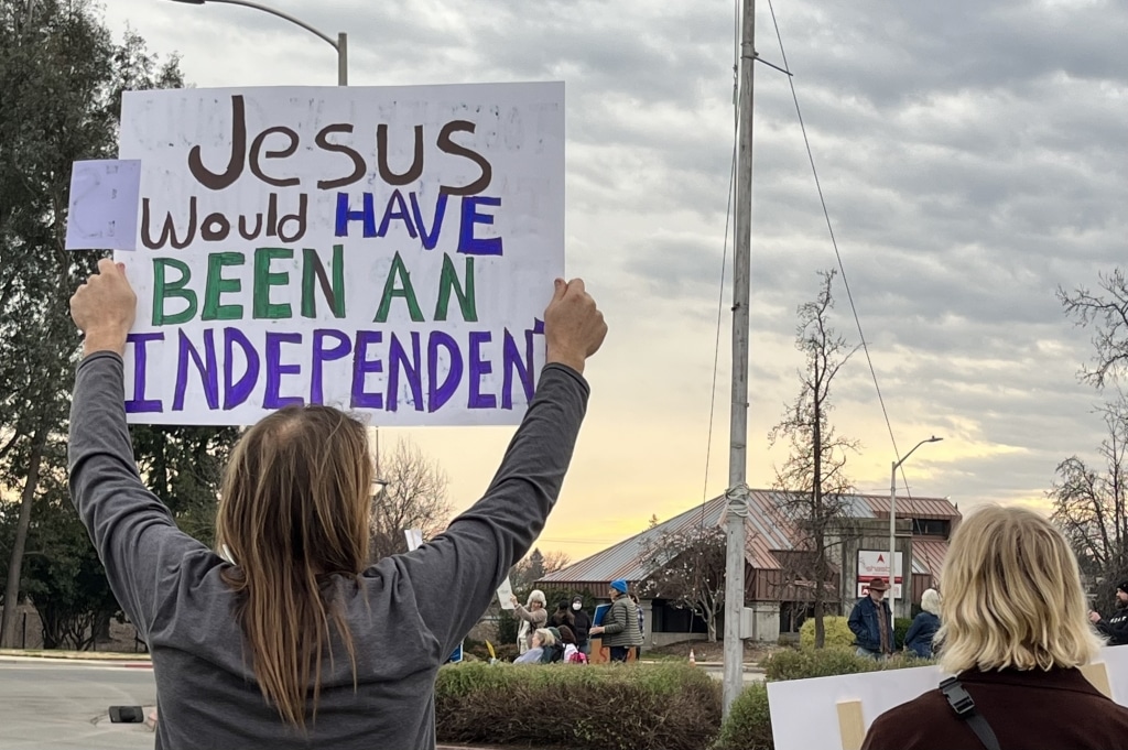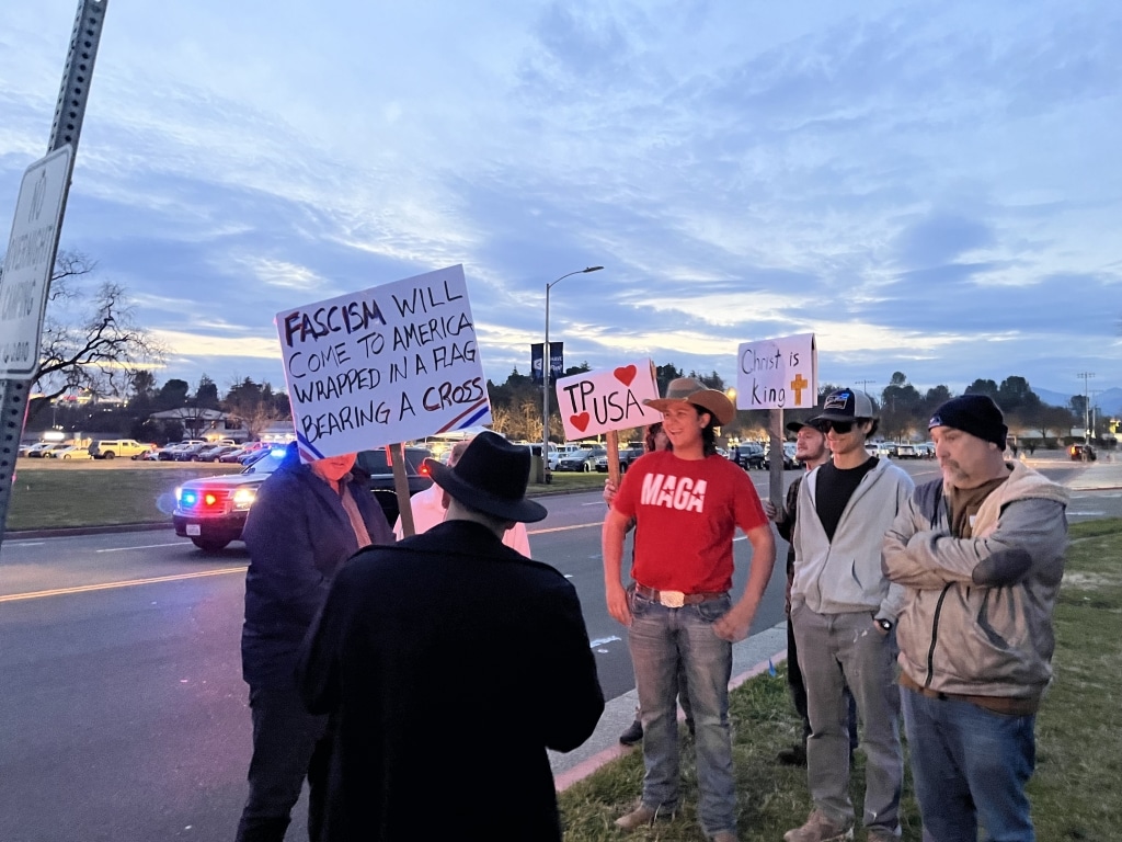 Another protester and Simpson University staff member said she supported TPUSA’s right to engage students politically, but took issue with the event using faith as an entry point, something which she described as disingenuous.