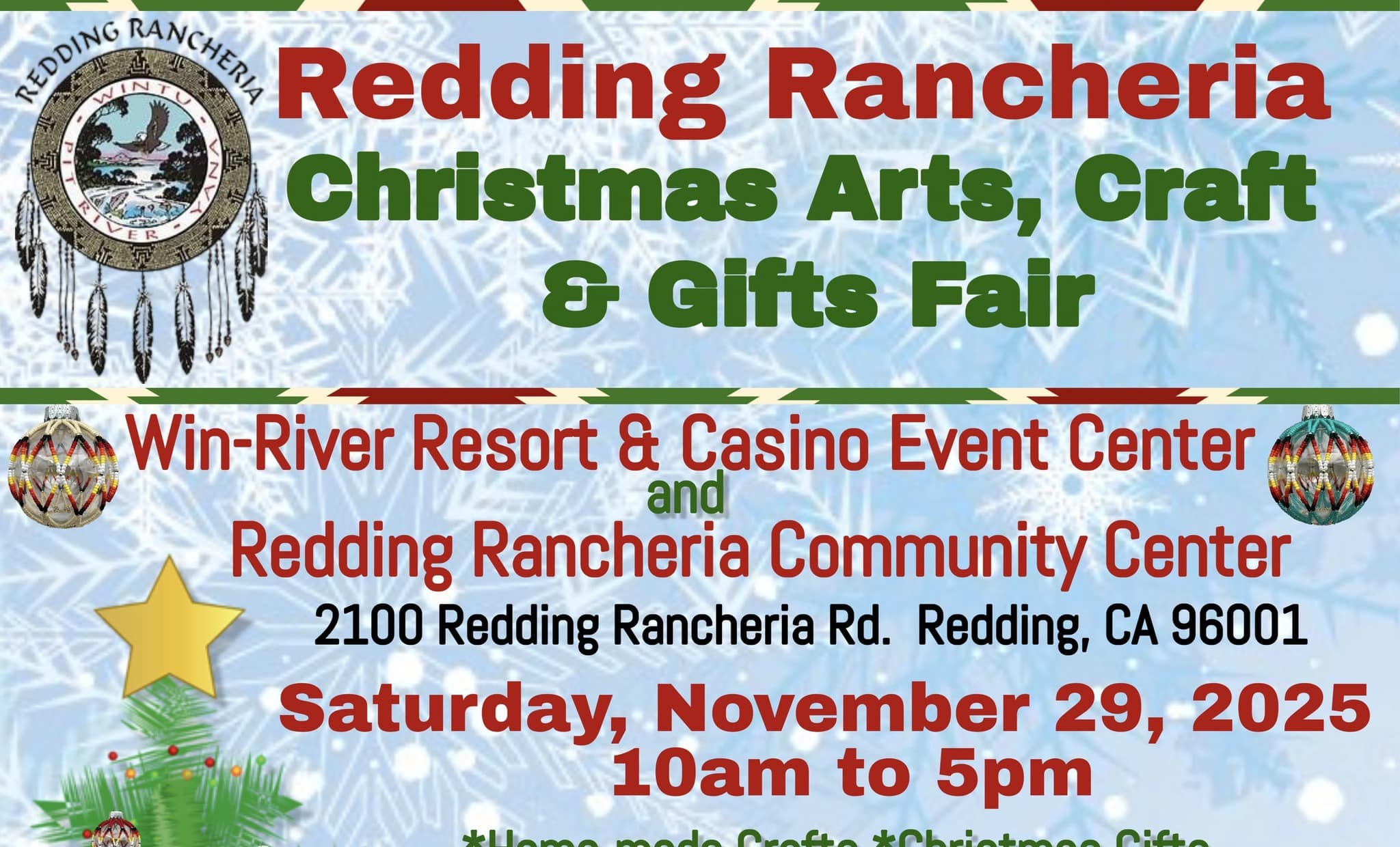 Win River Resort and Casino Event CenterRedding Rancheria Christmas Arts, Crafts & Gifts Fair Mark your calendars! Join us on Saturday, November 29, 2025, from 10 a.m. to 5 p.m. for a festive day of holiday shopping and community fun. Locations: Win-River Resort & Casino Event Center Redding Rancheria Community Center Enjoy homemade crafts, unique Christmas gifts, local jewelry, raffles, and […]