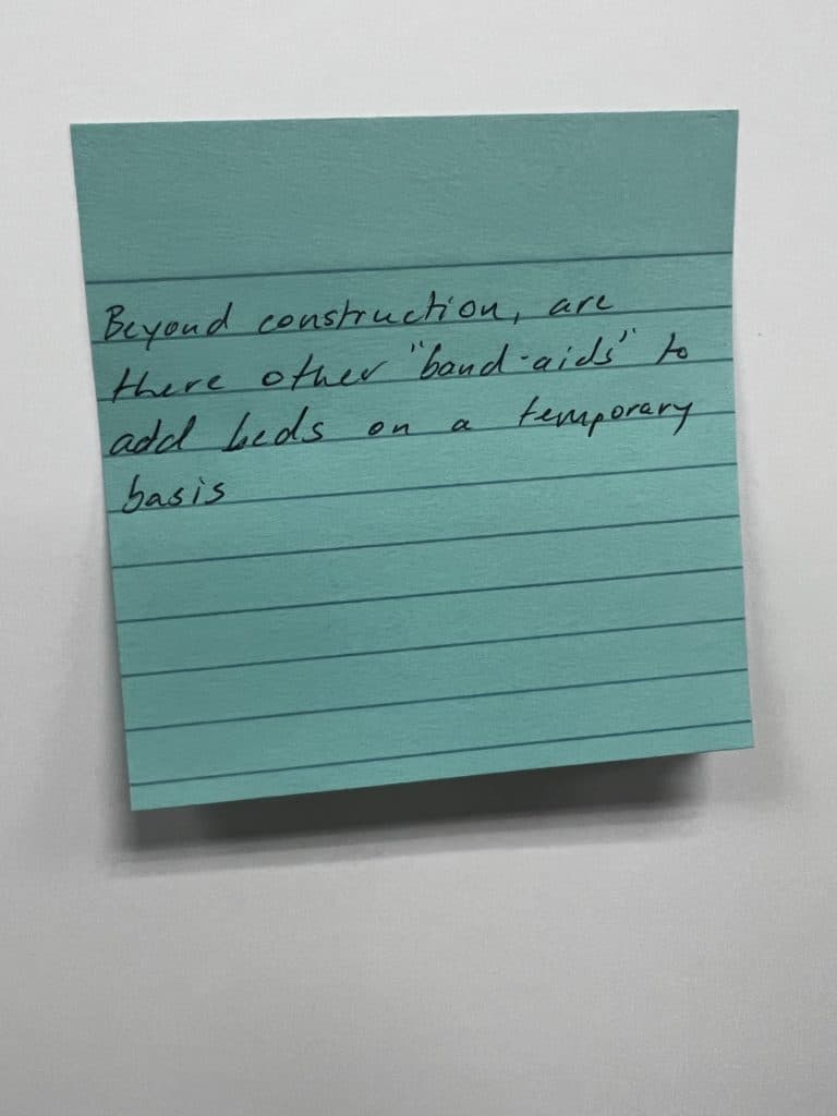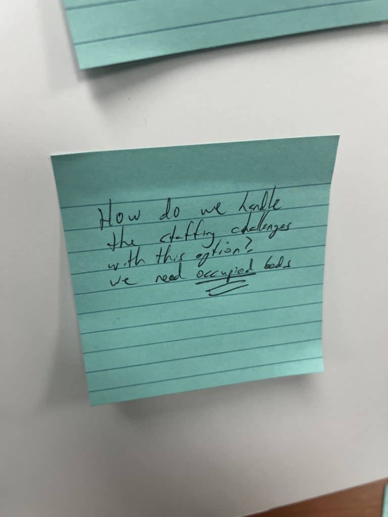 As the workshop concluded and the room cleared, the rainbow of post-it notes on the three sets of boards in the back of the room began to bring some of the big picture results of the workshop into focus, even from a distance. The majority of post-it notes had been placed on the board for Option 3, building a new jail facility outside of downtown. The notes represented perspectives both for and against the idea and included many questions.