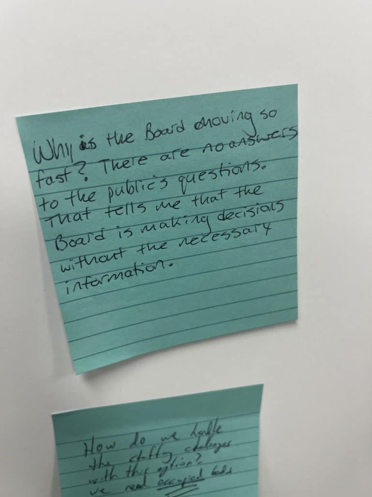 “I want answers too. I’m just here trying to do the job I was contracted to do. You’re asking all the right questions. I suggest you write them down on the papers we’ve provided and on the post-it notes we’re about to give you, so that your County Supervisors can really hear those questions and understand your perspectives.”